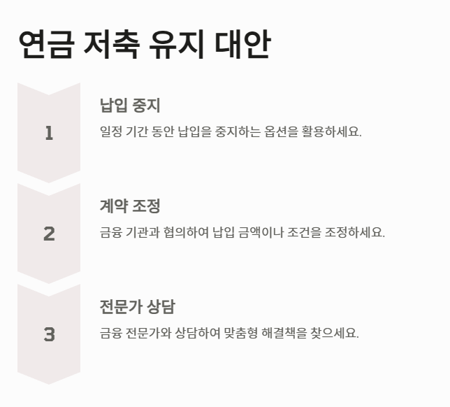 연금 저축을 유지하면서도 재정적 부담을 줄이는 방법도 고려할 가치가 있습니다. 예를 들어, 일부 연금 저축 상품에서는 일정 기간 동안 납입을 중지할 수 있는 옵션을 제공합니다. 이를 활용하면 단기적으로 재정적 여유를 확보할 수 있습니다.