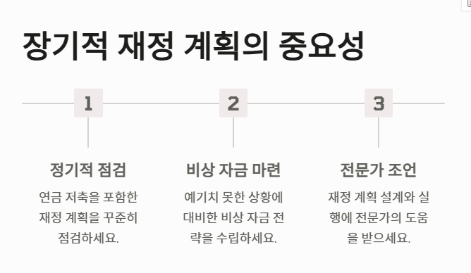연금 저축은 은퇴 이후의 안정적인 생활을 보장하기 위한 장기적 재정 계획의 핵심 도구 중 하나입니다. 따라서 연금 저축을 활용한 재정 계획은 꾸준히 점검하고 조정해야 합니다. 예기치 못한 상황에서도 안정적으로 대처할 수 있도록 비상 자금 마련 전략을 포함하는 것이 중요합니다.