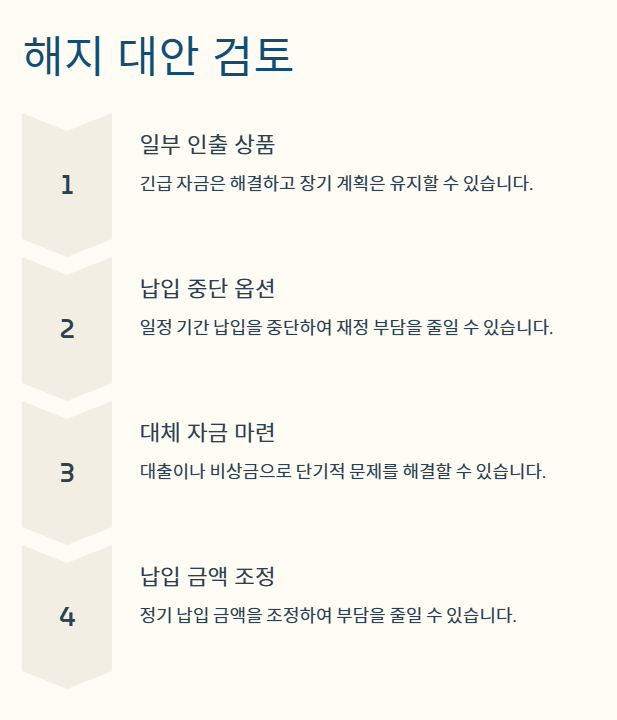 금융사와 상담하여 일정 기간 동안 납입을 중단하는 옵션을 활용하면 해지 없이 재정 부담을 줄일 수 있습니다. - 대체 자금 마련