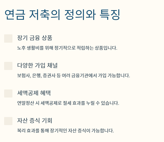 연금 저축은 개인이 노후 생활비를 대비하기 위해 정기적으로 일정 금액을 적립하는 장기 금융 상품입니다. 이 상품은 노후 안정성을 높이고 경제적 여유를 제공할 수 있는 주요 수단으로 널리 활용되고 있습니다.