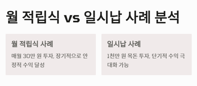 - 시장 변동성 대응: 월 적립식은 시장 변동성을 활용하여 안정적인 평균 단가를 형성하고, 일시납은 변동성이 큰 시장에서 수익률이 극대화될 수 있는 반면 손실 가능성도 높아집니다.