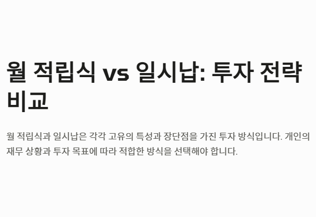 - 일시납: 큰 금액을 한 번에 투자하기 때문에 수익률이 높아질 가능성이 있지만, 손실 위험 또한 크다는 점을 명심해야 합니다. 시장의 상승과 하락을 예측하는 것이 성공의 핵심입니다.