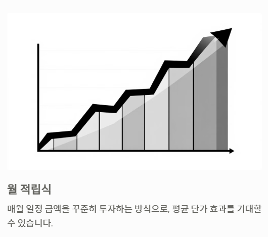 - 월 적립식: 투자 금액이 분산되어 있기 때문에 시장 변동성에 영향을 덜 받고 안정적인 수익을 기대할 수 있습니다. 특히, 장기적으로 평균 매입 단가를 낮출 수 있는 장점이 있습니다.
